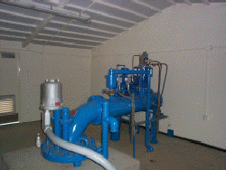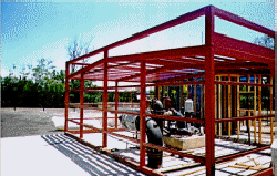 The steel frames are fabricated in our shop then taken to the site and erected. As you can see in the photo on the left, our buildings can take on a variety of shapes and sizes. The customers chose a 24'0" by 24'0" RollApart and added a parapet. They also chose to install a dividing wall between the fixed portion and moving portion, providing them with two sealed rooms in which to house the electrical panels and the chlorination system. The photo bottom right shows the finished interior of the moving portion of this building. Note the steel framing of the roof. In the bottom left picture, one can see a typical structural connection. this is the rigid steel frame before paint has been applied.